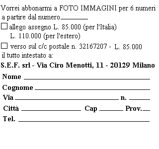 Una rivista moderna e raffinata che ogni due mesi vi offre le immagini dei fotografi più prestigiosi, le mostre più importanti, i libri più significativi, sconto del 20%, in esclusiva agli abbonati, sulle pubblicazioni delle più interessanti case editrici italiane. Inoltre, le novità della tecnica, le aste, una rassegna stampa sulle riviste di fotografia internazionale. Tutto questo e altro a sole 85.000 lire annue per sei numeri (110.000 lire per l'estero), con un risparmio di ben 20.000 lire annue. |